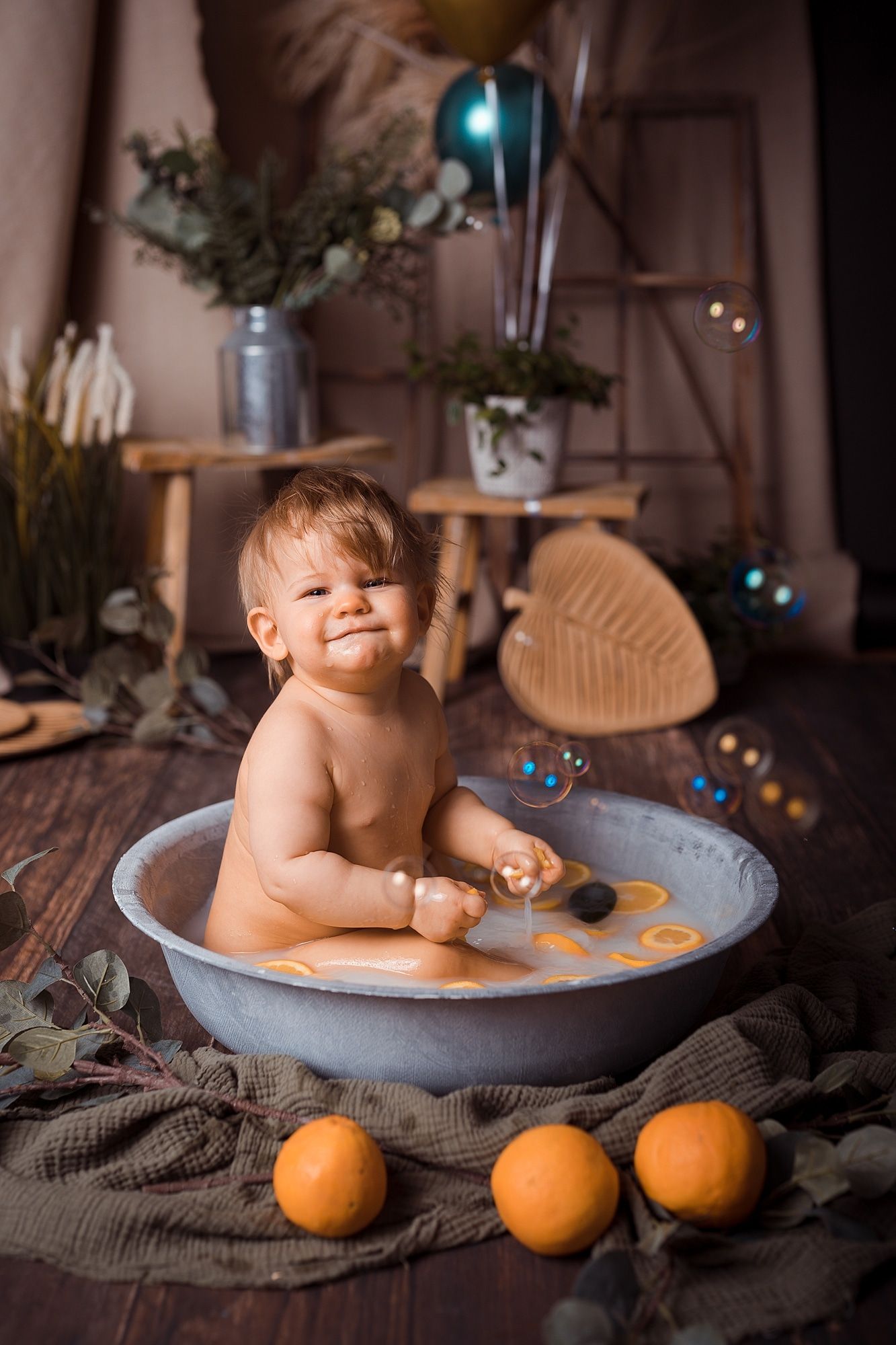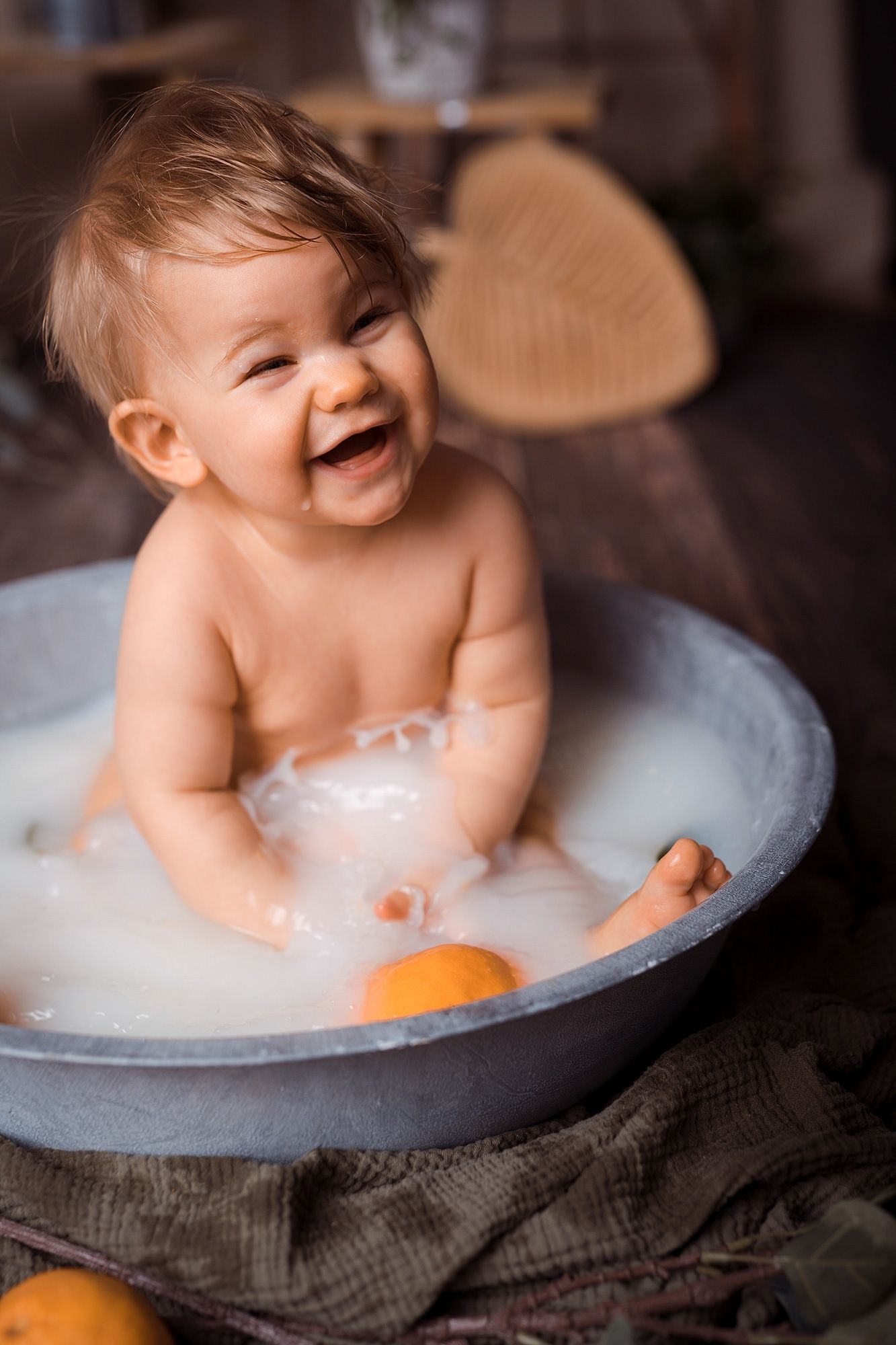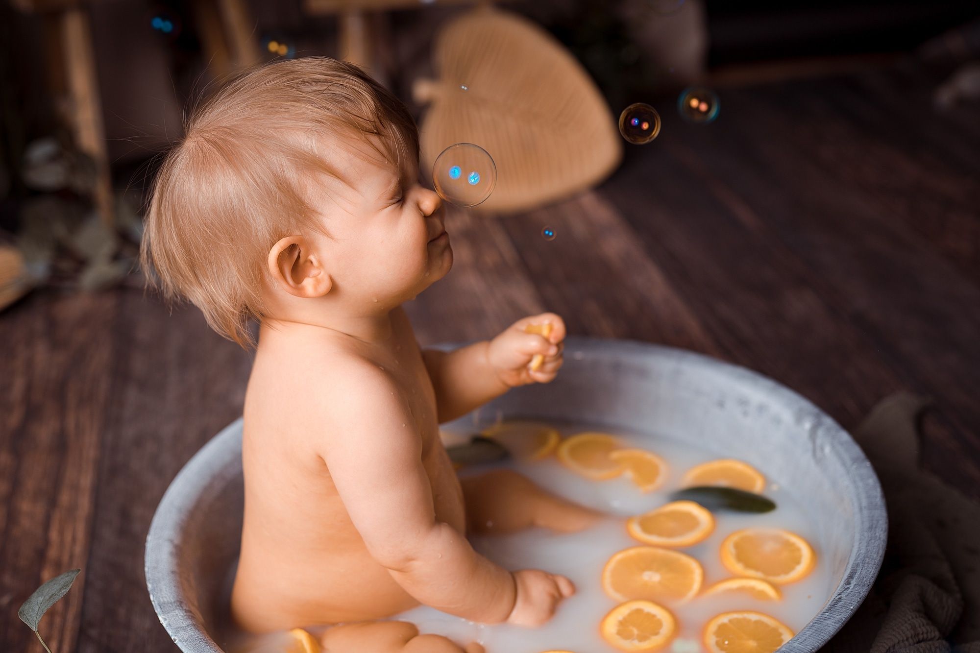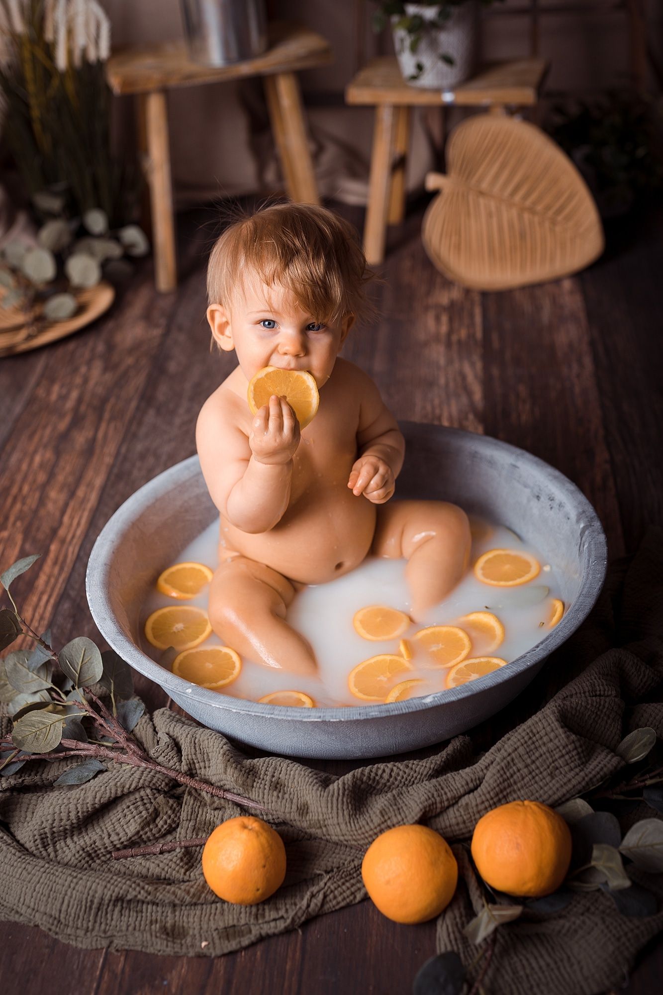 Wir setzten das Baby gerne nackig rein. Und als i-Tüpfelchen empfehle ich, dass ihr noch Obst mitbringt, welches wir ins Milchbad werfen können! Am meisten werden Orangen mitgebracht, da diese aufgeschnitten wunderschön aussehen und natürlich auch schwimmen. <3